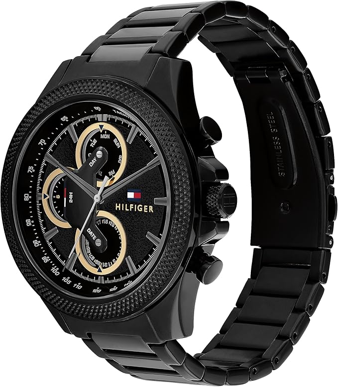 The Tommy Hilfiger Clark 1792081 is a stylish men’s watch from the Clark collection. It features a 46mm black-finished stainless steel case with a multifunction black dial displaying day, date, and 24-hour subdials. The watch is powered by a reliable quartz movement and is water-resistant up to 50 meters, making it suitable for everyday wear. The black stainless steel bracelet adds a modern touch to its design.