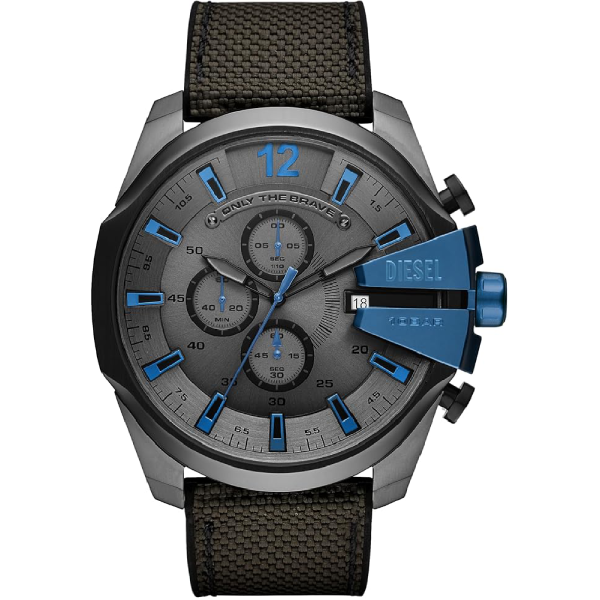 The Diesel DZ4500 Mega Chief Chronograph delivers a robust and sporty design. It features a 51 mm stainless steel case housing a gray dial with blue accents. The black + gray nylon/silicone strap adds a rugged, casual look. Chronograph subdials and a date window make this watch functional for timing needs. With 10 ATM water resistance, it’s suitable for swimming or surface water exposure, and its mineral crystal offers decent everyday durability.
