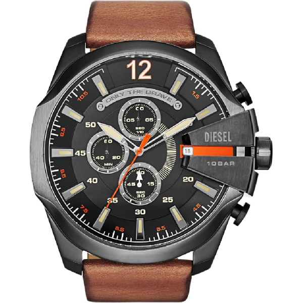 The Diesel Mega Chief DZ4343 offers a striking combination of bold design and functional utility. Its large 51×59 mm gunmetal-plated stainless steel case houses a black dial fitted with chronograph subdials and a date window. The warm brown leather strap adds a classic contrast to the rugged case. With 10 ATM water resistance, this watch is suitable for daily use including swimming and moisture exposure. The quartz chronograph movement ensures reliable and accurate timekeeping.