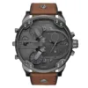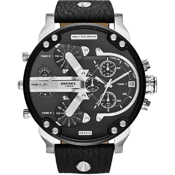The Diesel Mr. Daddy 2.0 DZ7313 is a bold, statement-making timepiece boasting an oversized 57 mm case and a multi-layered dial that supports chronograph functions, multiple time zones, and date display. With a black leather strap and aggressive design elements (screws, hardware, bold indices), it captures Diesel’s rugged aesthetic. Water resistance up to 30 m and a mineral glass crystal provide practical durability for everyday wear.